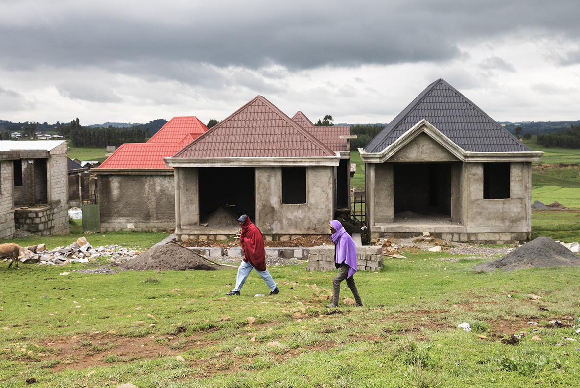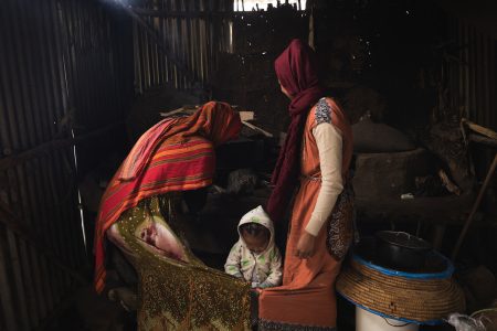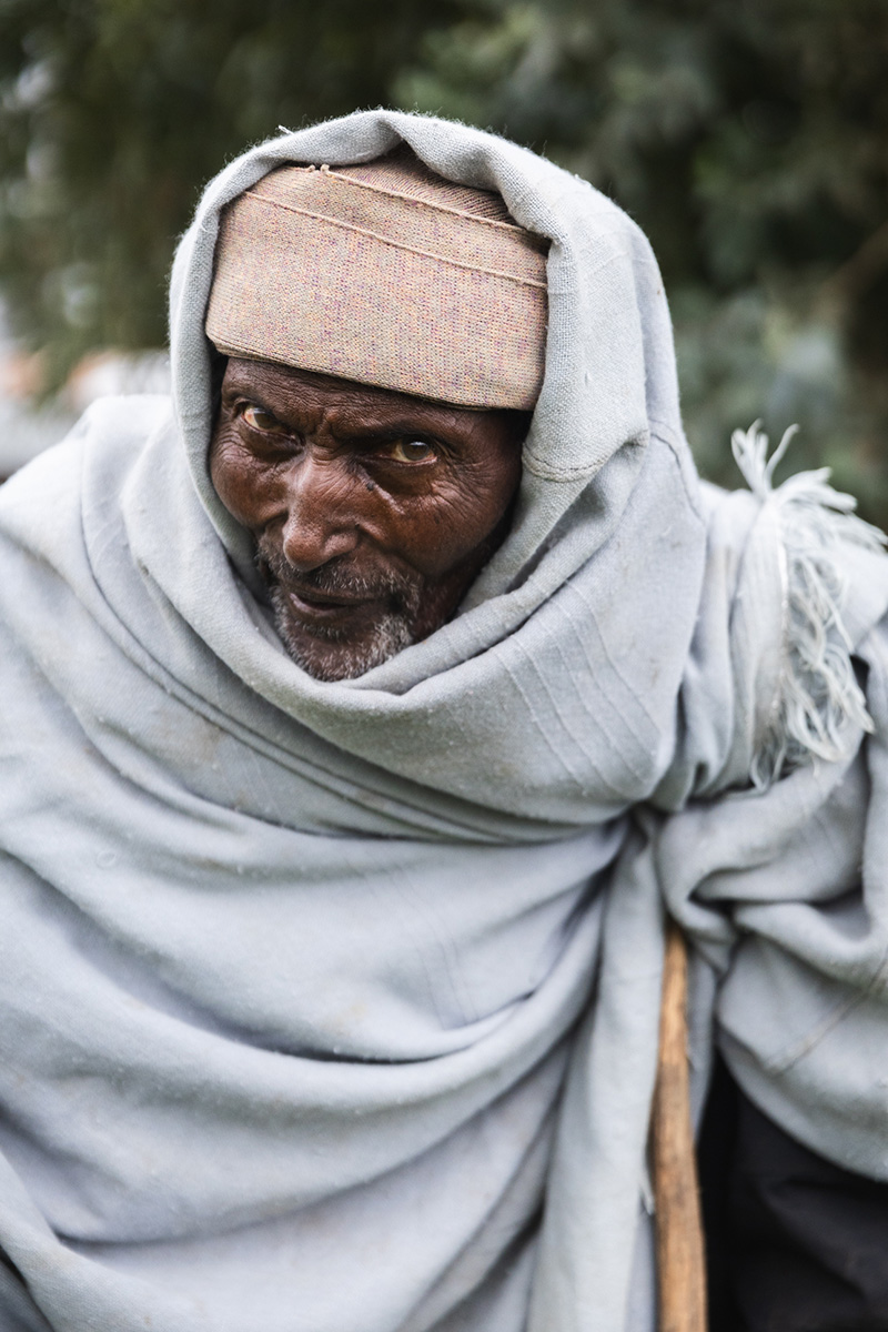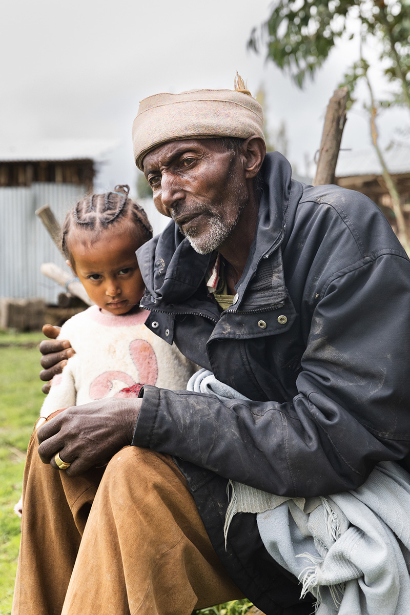 Tekilemichael Mulugeta, 75 anni, e sua nipote Mihret Getachew (5 anni) sono stati fotografati nel villaggio di Atakit, nell’Etiopia centrale, dove vivono. Lui è un anziano rispettato del villaggio che ha prestato servizio come soldato durante il regime del Derg. Un tempo grande proprietario terriero, gli è stata sottratta la maggior parte dei suoi terreni, lasciandogli solo 0,75 ettari. I suoi figli, che ora vivono altrove, non gli forniscono alcun sostegno, eppure lui rimane attivo nella comunità, mediando i conflitti e gestendo un’associazione informale locale che aiuta i membri nei momenti di lutto. La sua famiglia non è allacciata alla rete elettrica ma utilizza un pannello solare personale, si rifornisce di acqua dal fiume e non dispone di servizi igienici. L’ospedale e la scuola più vicini distano entrambi 30 minuti a piedi. La famiglia ricava il proprio reddito dall’agricoltura e da una piccola attività commerciale, anche se le piogge insolite dello scorso anno, le piogge tardive e i danni alle colture causati dai parassiti hanno compromesso il loro raccolto.